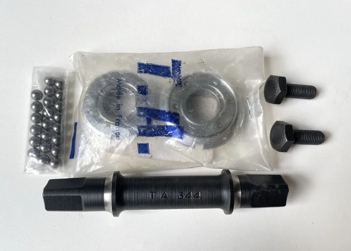 Complete NOS TA bottom bracket, incudes cups, axle, bolts & bearings as pictured.