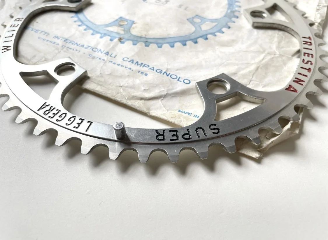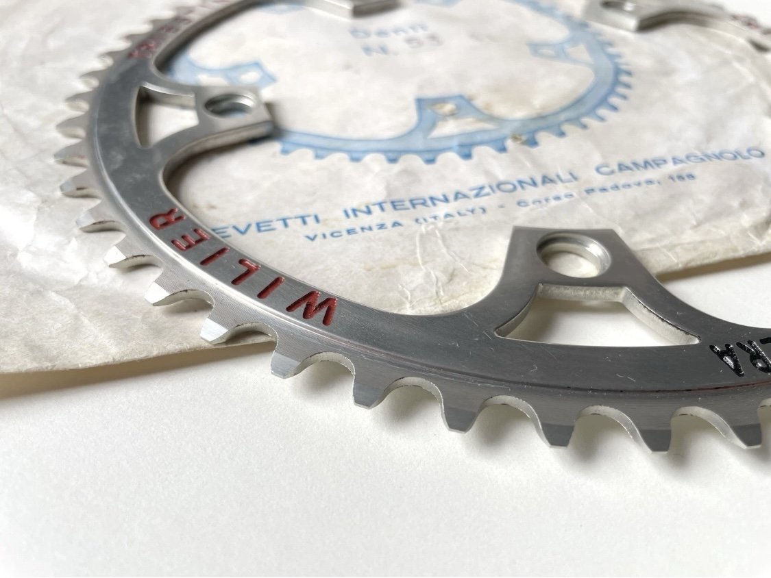 Vintage 1980s Campagnolo Super Record WILIER Superleggera Panto 53T chainring in New Old Stock condition.