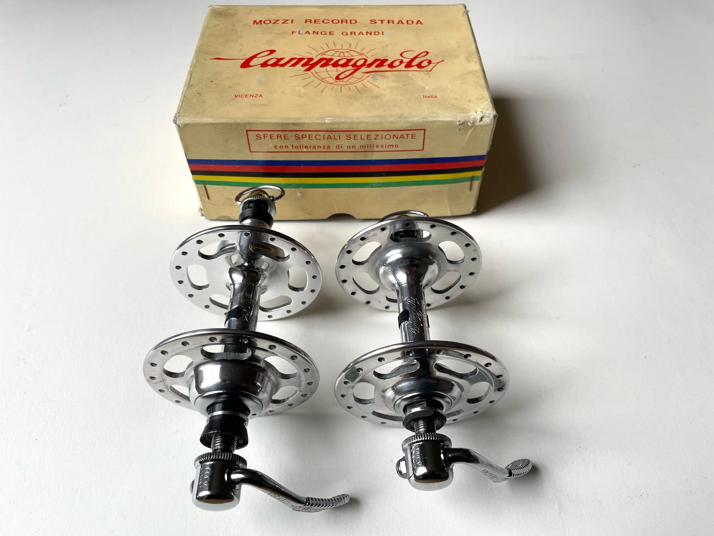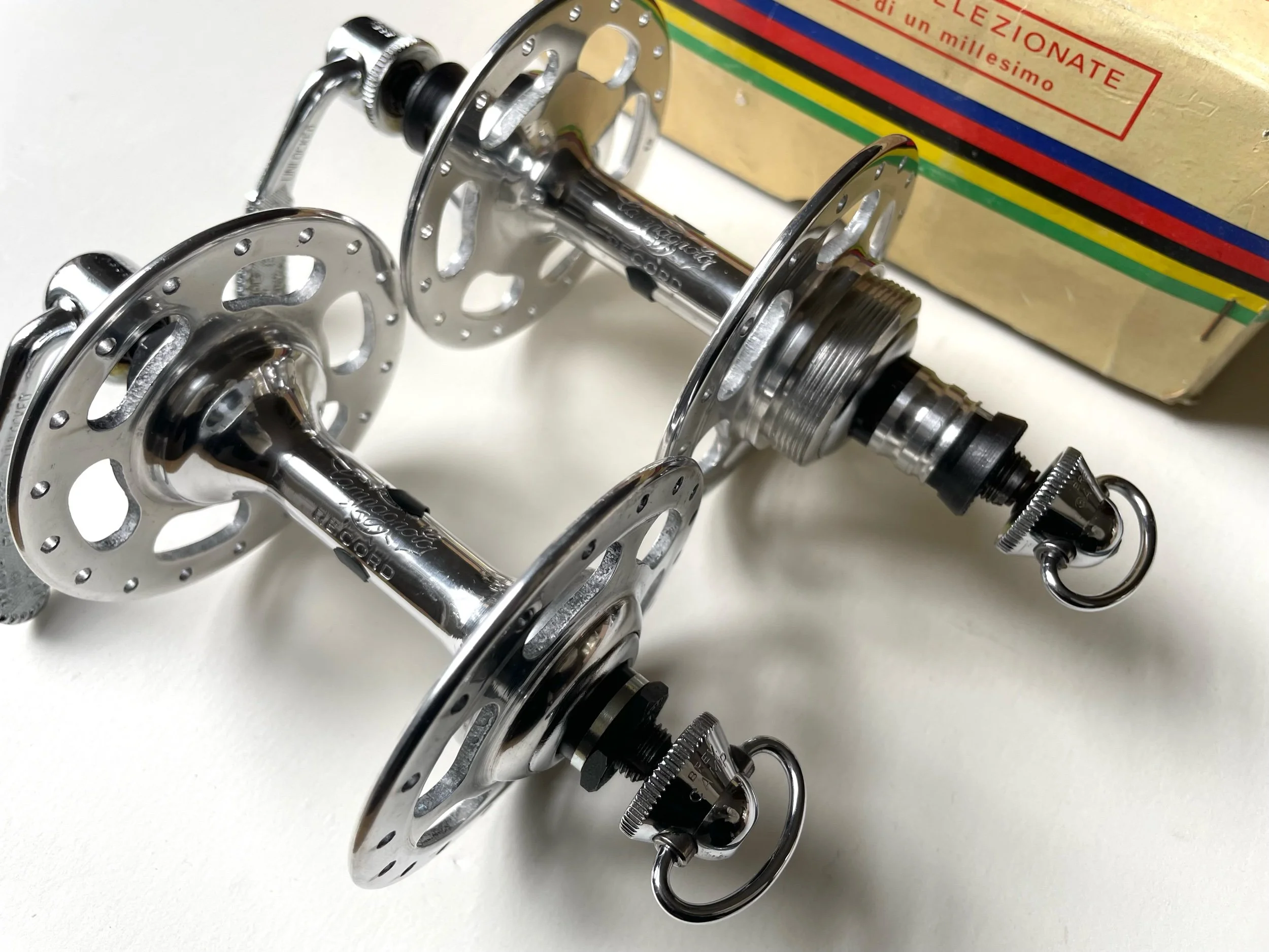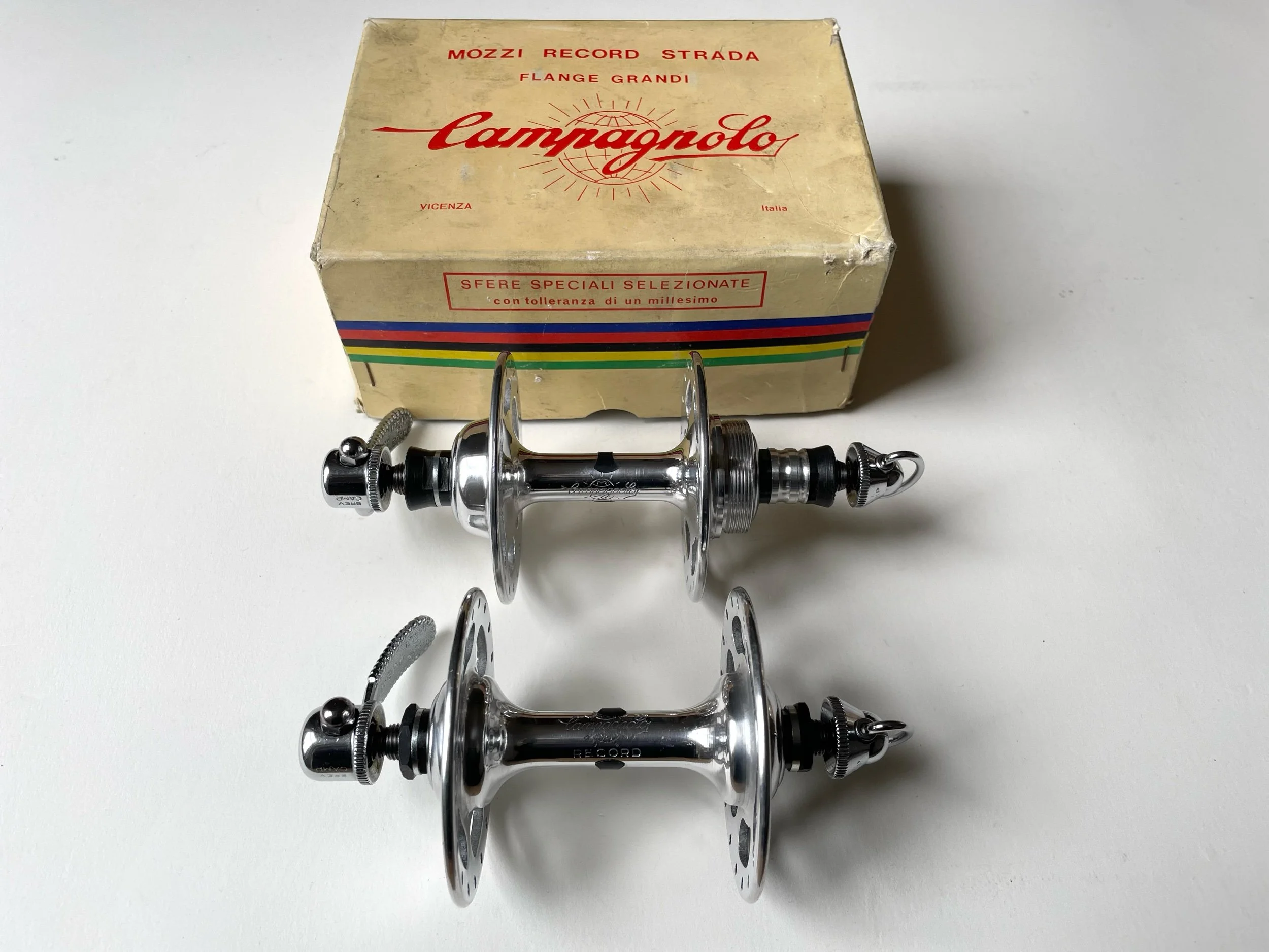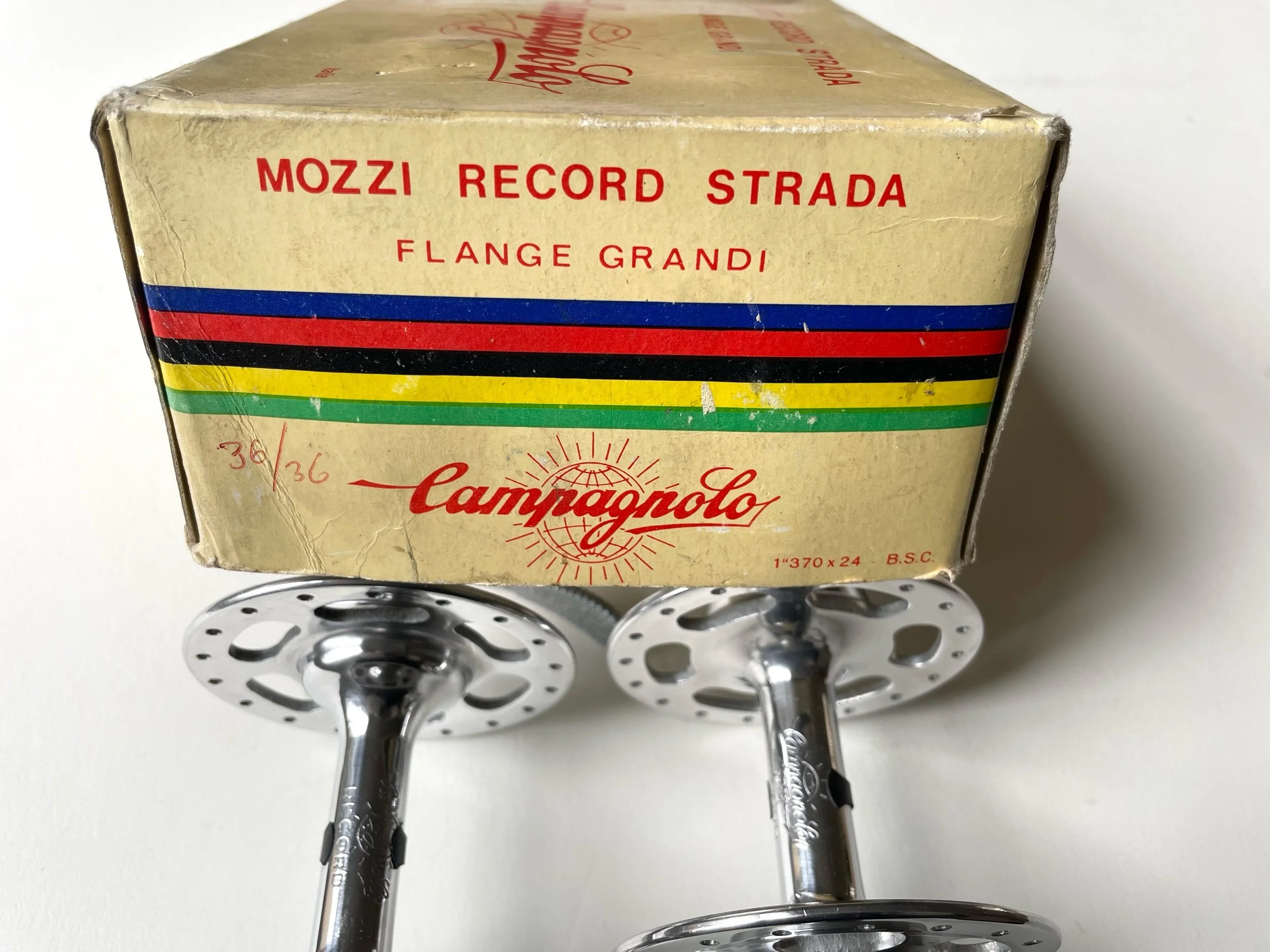 Vintage 1970s Campagnolo Record Strada large flange 36 hole track hubs in New Old Stock condition.