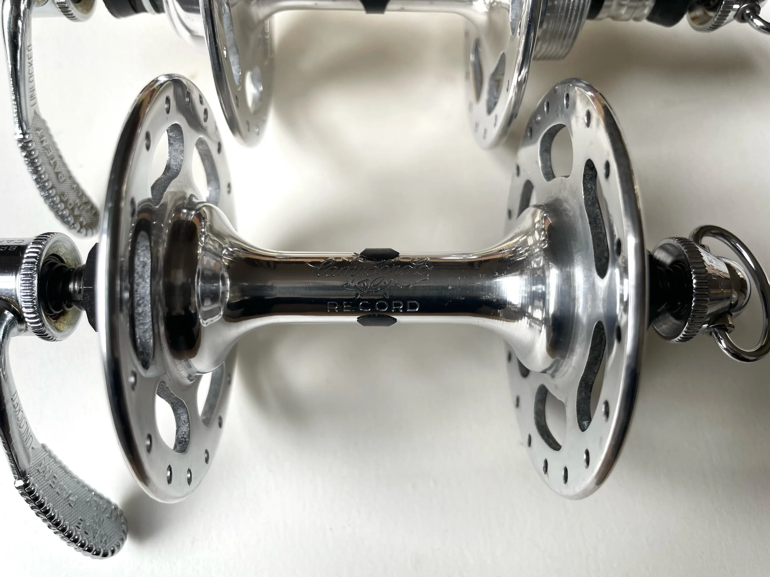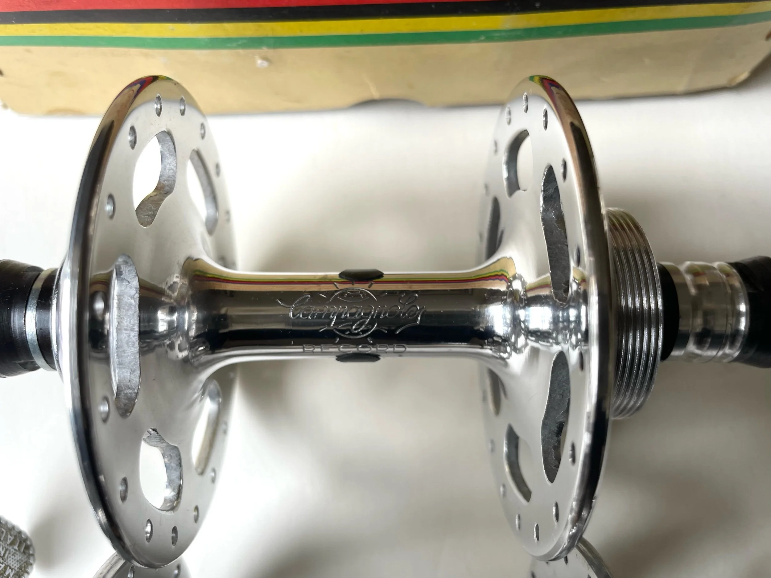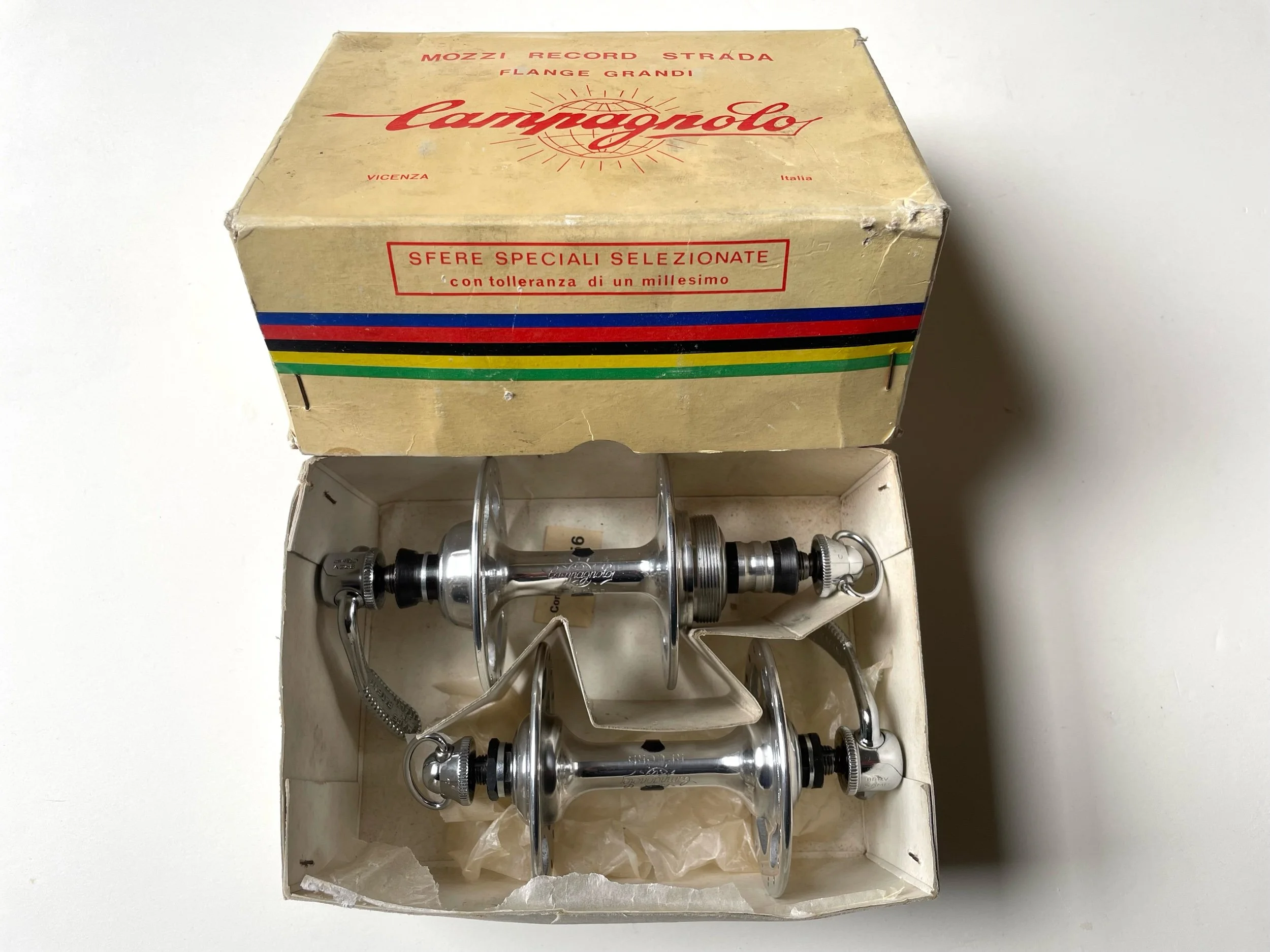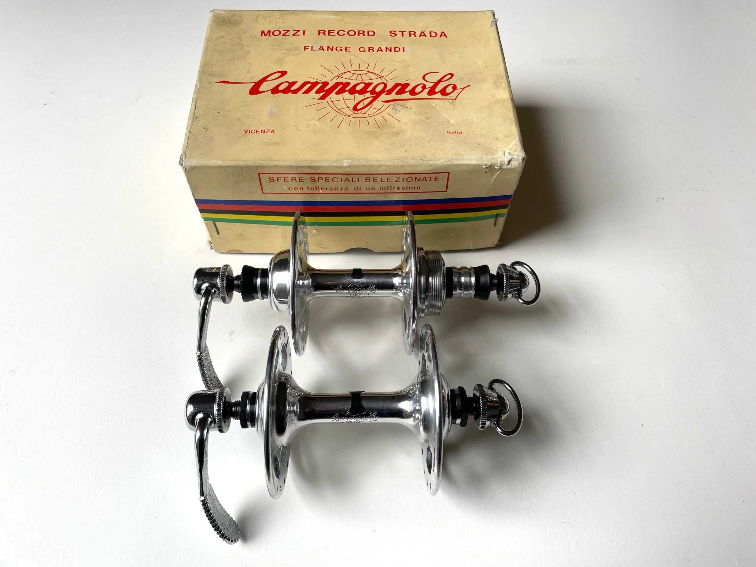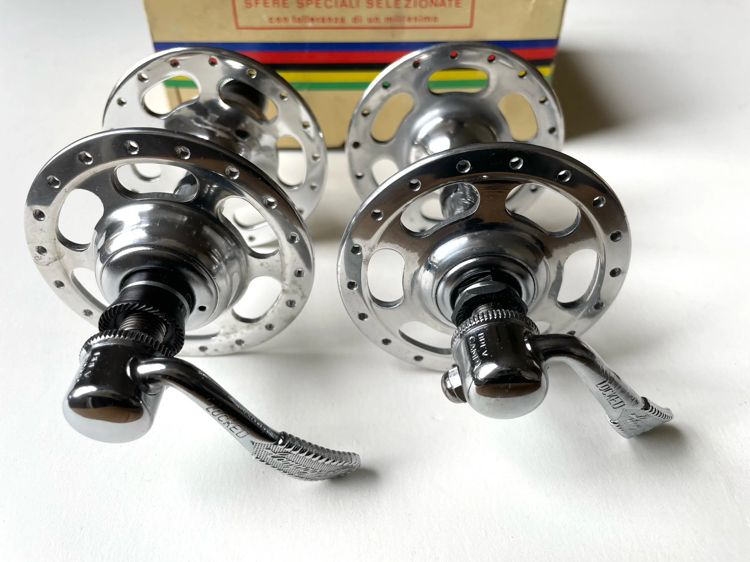 Vintage 1970s Campagnolo Record Strada large flange 36 hole track hubs in New Old Stock condition.